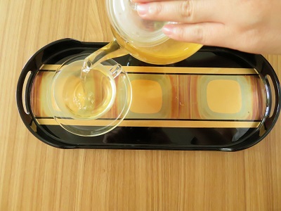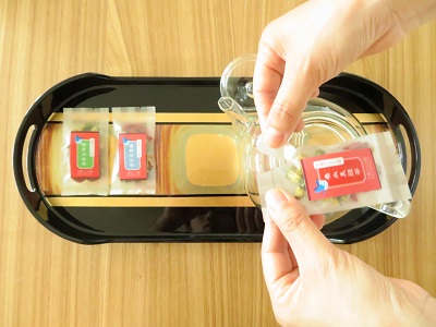 お茶を急須にやさしく入れます。ものによってはパッケージから出にくい素材もありますのでご注意ください。