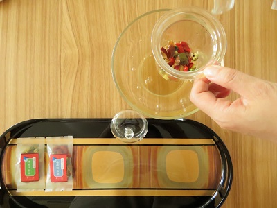 約95℃のお湯を材料がお湯で隠れる程度までの量をやさしくゆっくりと注ぎます。この時、 材料をお湯柱でかき混ぜるような気持で注ぐとより香が引き立ちます。