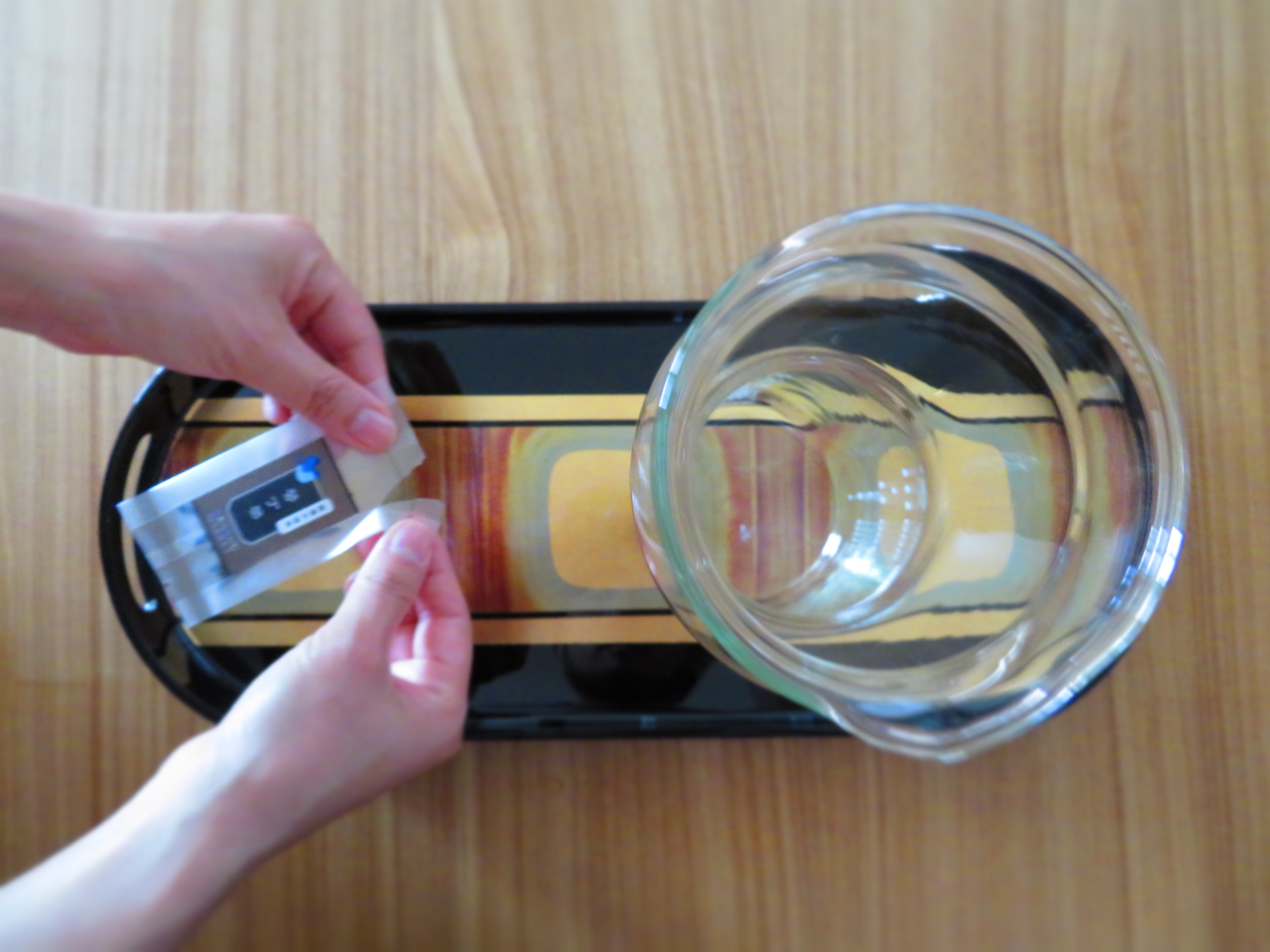 常温の水(水道水、若しくは天然水(軟水オススメ))を約1リットル、水筒に注ぎます。そしてそのまま冷蔵庫で約10時間水出し作業をします。