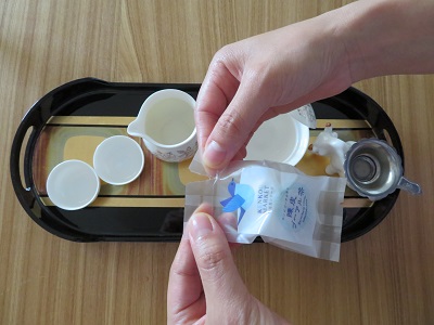 パックを開けお茶を取り出します。お茶が崩れやすい状態になっていることがありますので優しく丁寧に開封してください。
