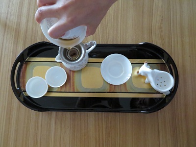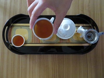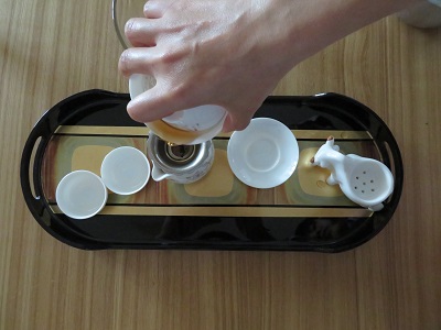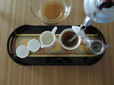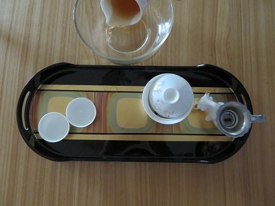 その後、一旦お茶を捨てます。日本の茶器を使用している場合は、茶漉しがついていますのでそのままお湯を捨てて下さい。 この時、非常によい香りが立ちますので五感でお茶をお楽しみください。